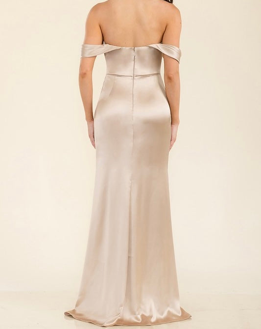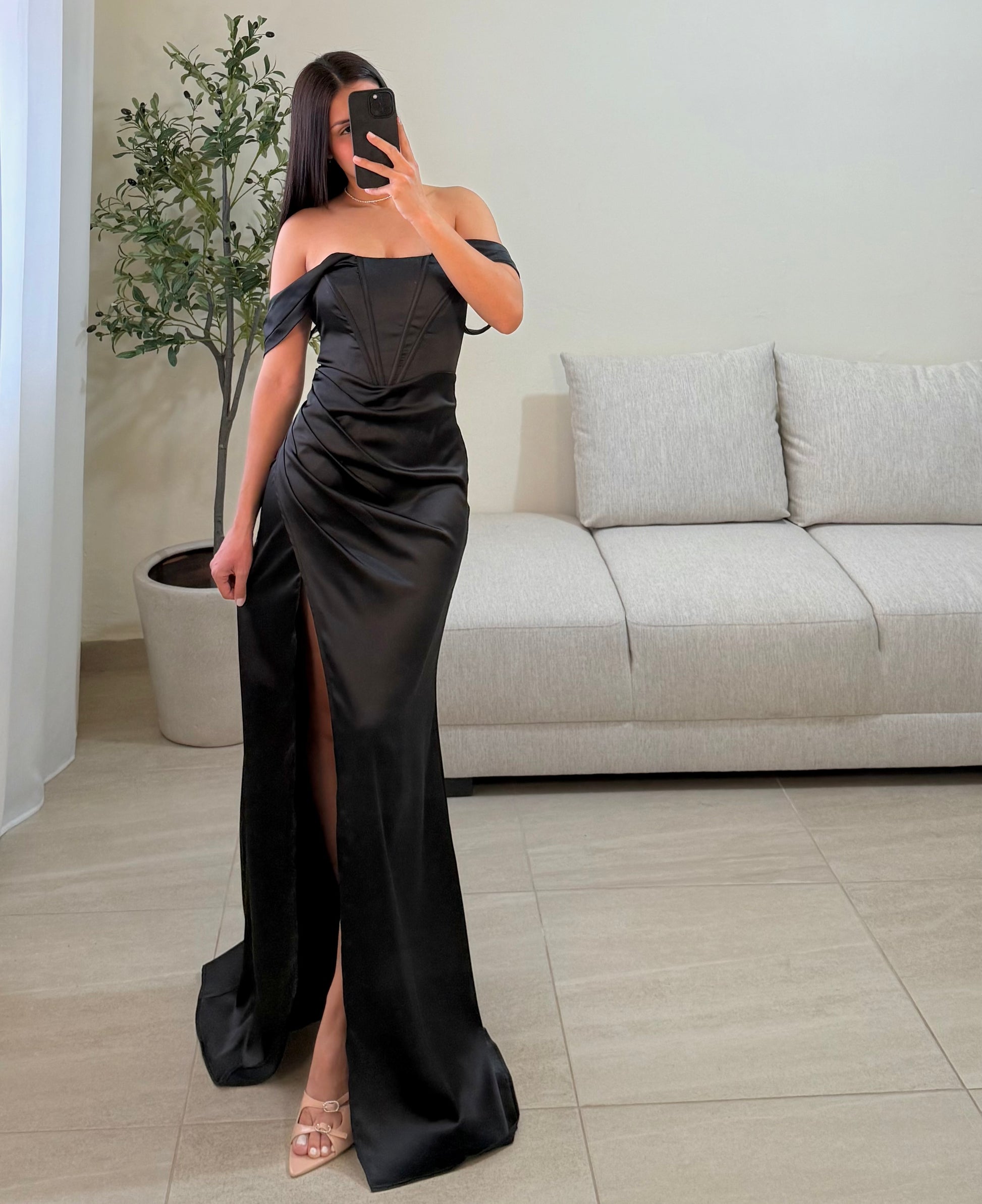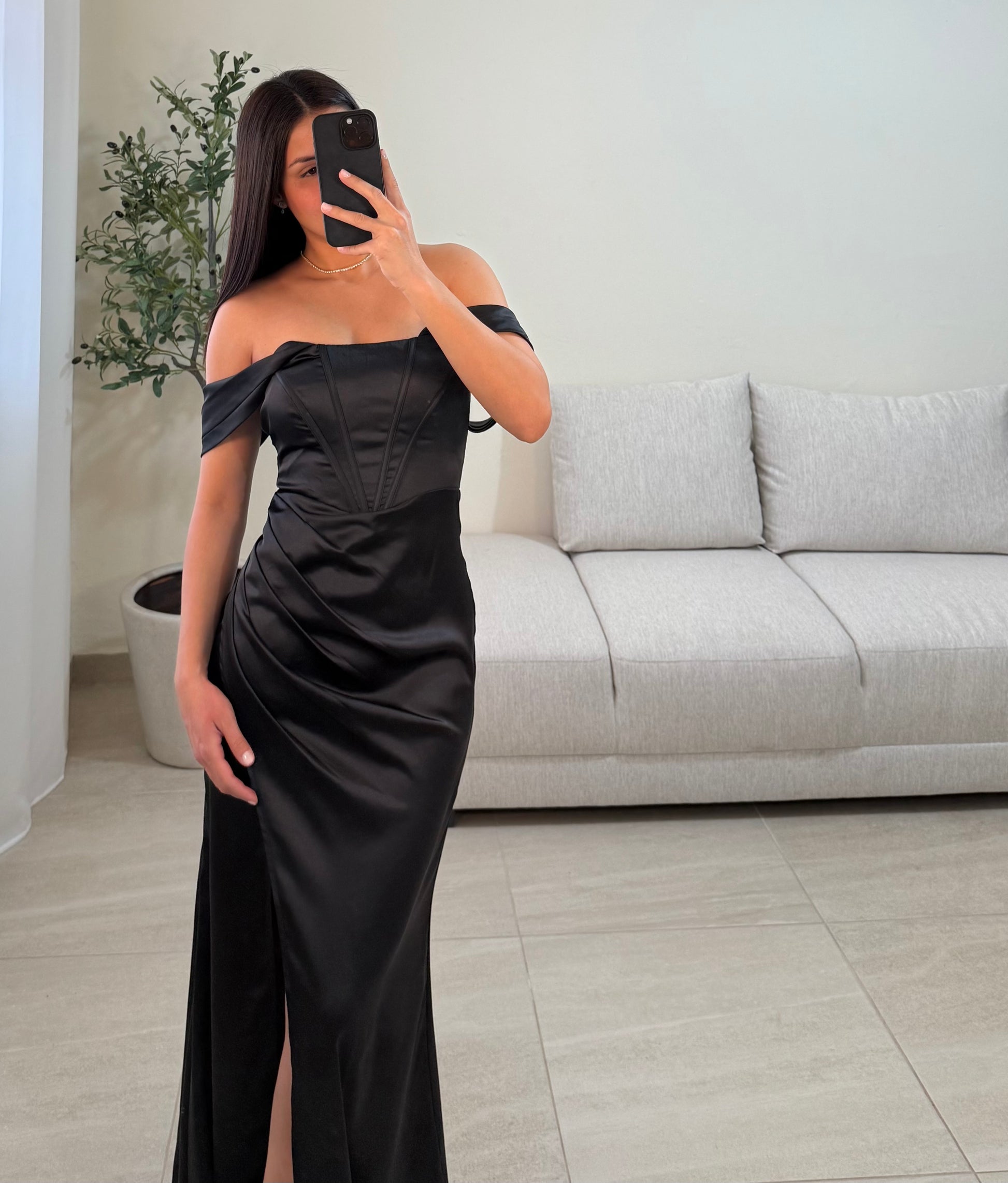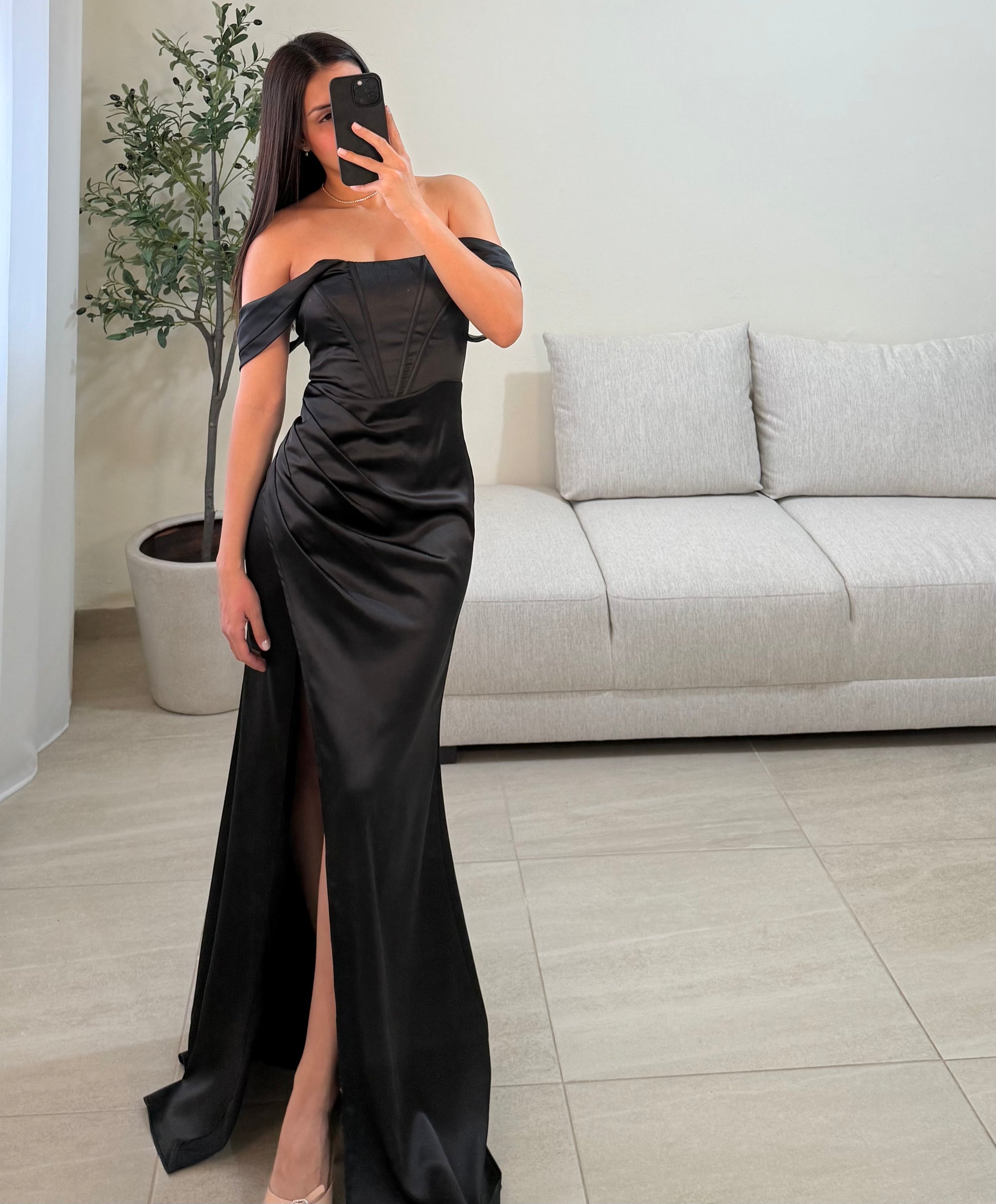Vestido drapeado satinado color negro, corset con varilla, mangas caídas con doble uso, abertura en pierna y zíper en espalda.