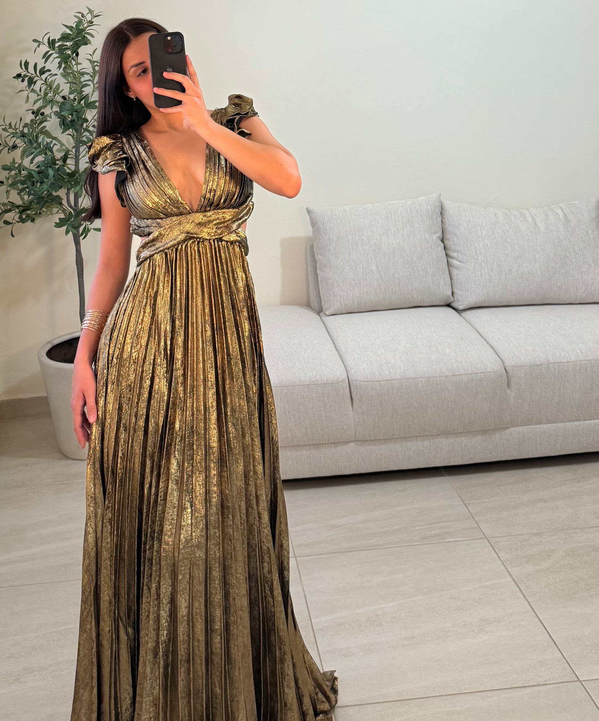 Vestido plisado color dorado con negro, mangas con olan, espalda descubierta cruzada, elástico en cintura y zíper en espalda baja.