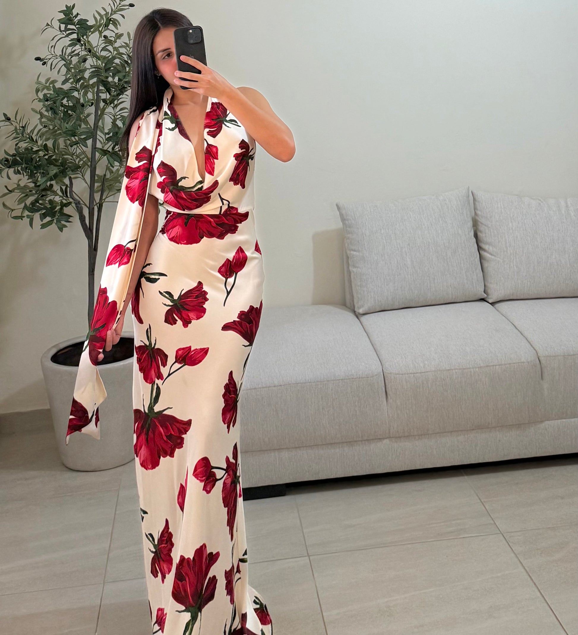 Vestido halter satinado con estampado de flores rojas, fondo Ivory, espalda descubierta.