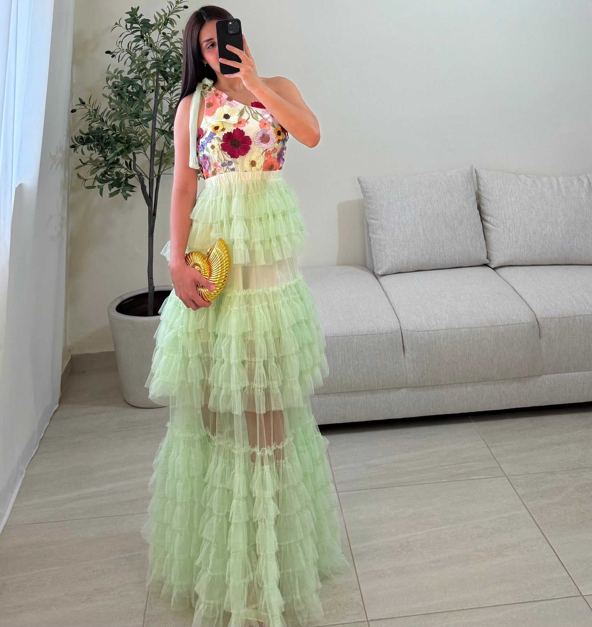 Vestido de tul con transparencia, bordado de flores en el top y elástico en la cintura.