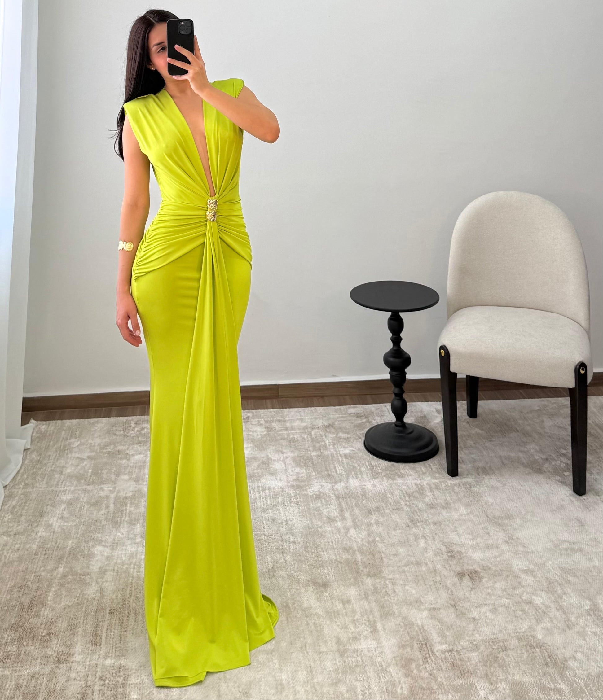 Vestido corte sirena color verde lima con broche de metal dorado, diseño fruncido.