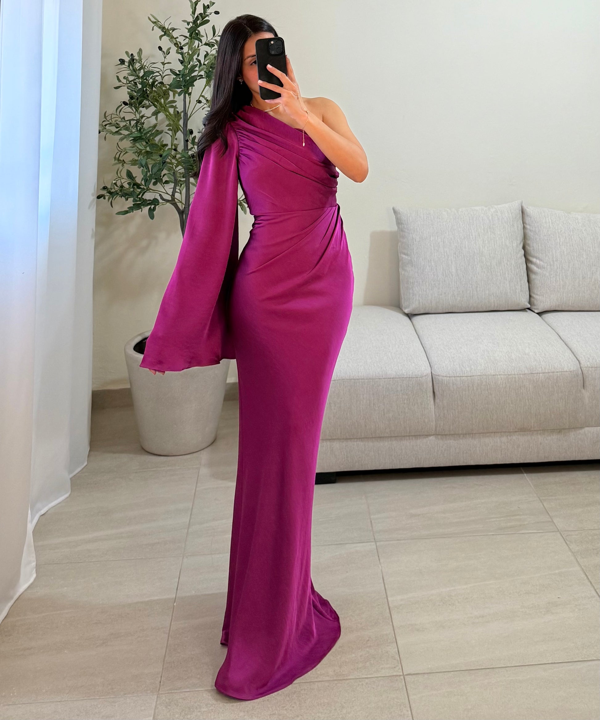Vestido satinado color magenta/fucsia con una manga acampanada, drapeado en la cintura, zíper lateral.