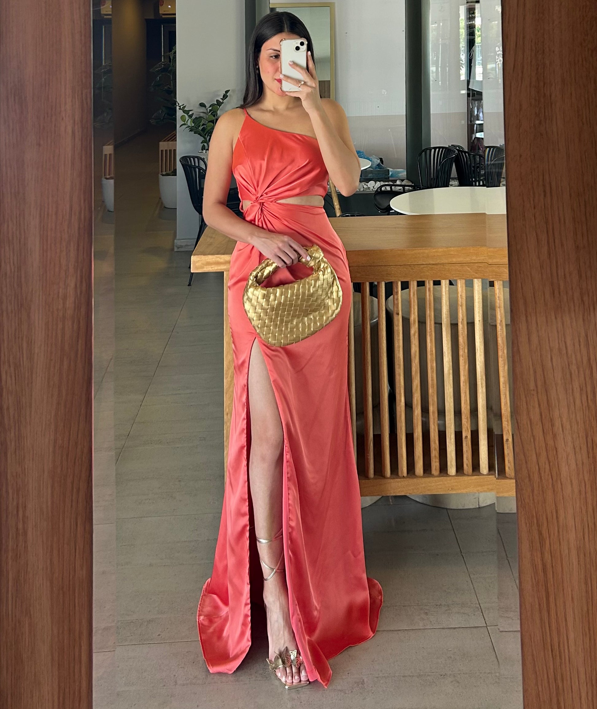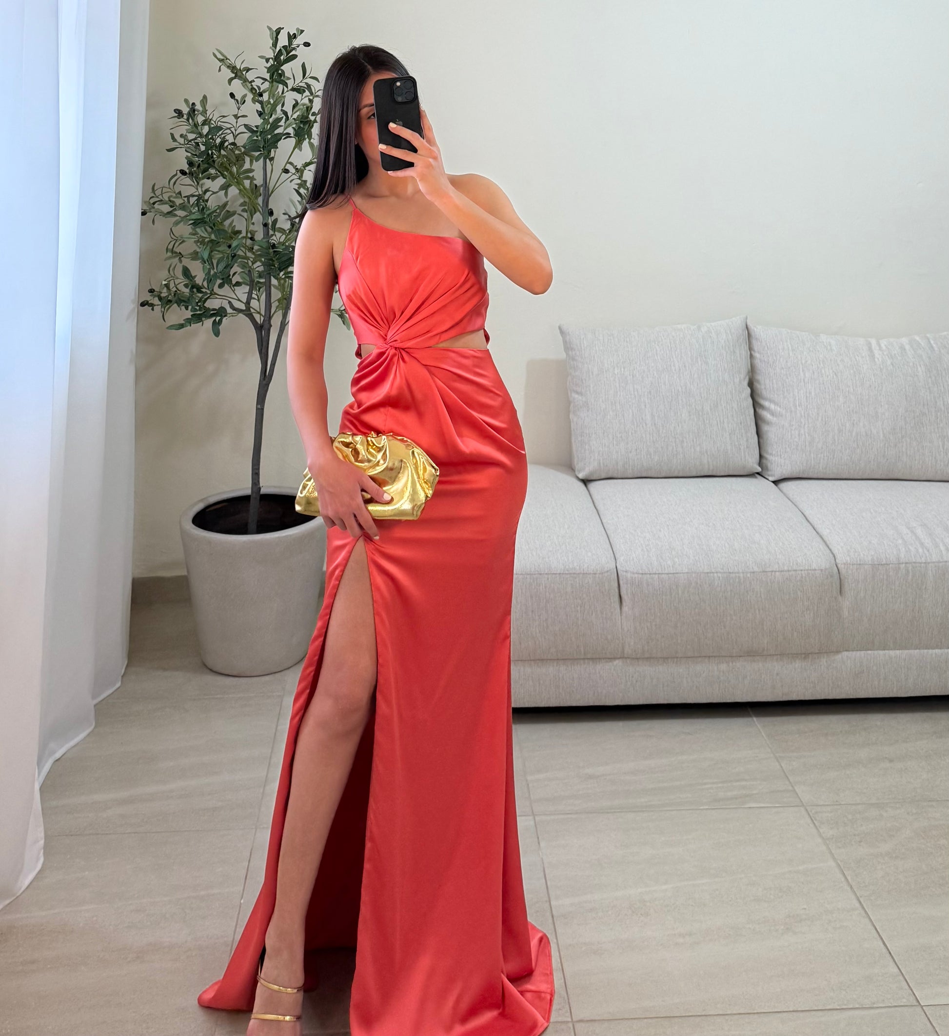 Vestido satinado color salmón, drapeado de la cintura, abertura en cintura y pierna, zíper en espalda.