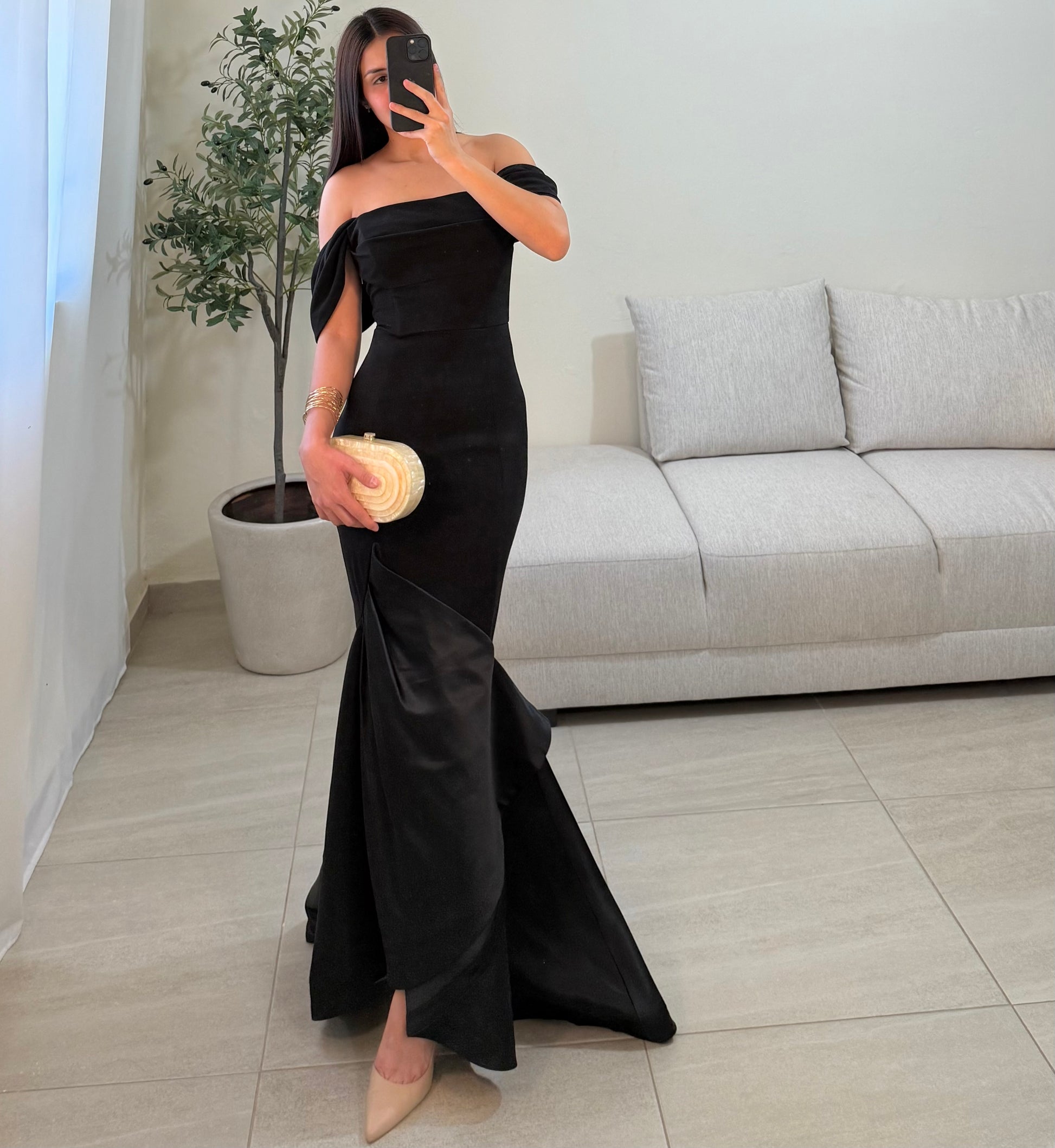Vestido corte sirena color negro con manga caída y contraste de tela satinada, stretch.
