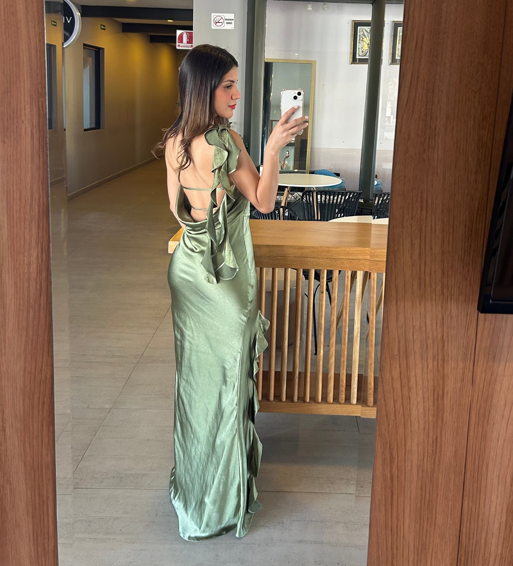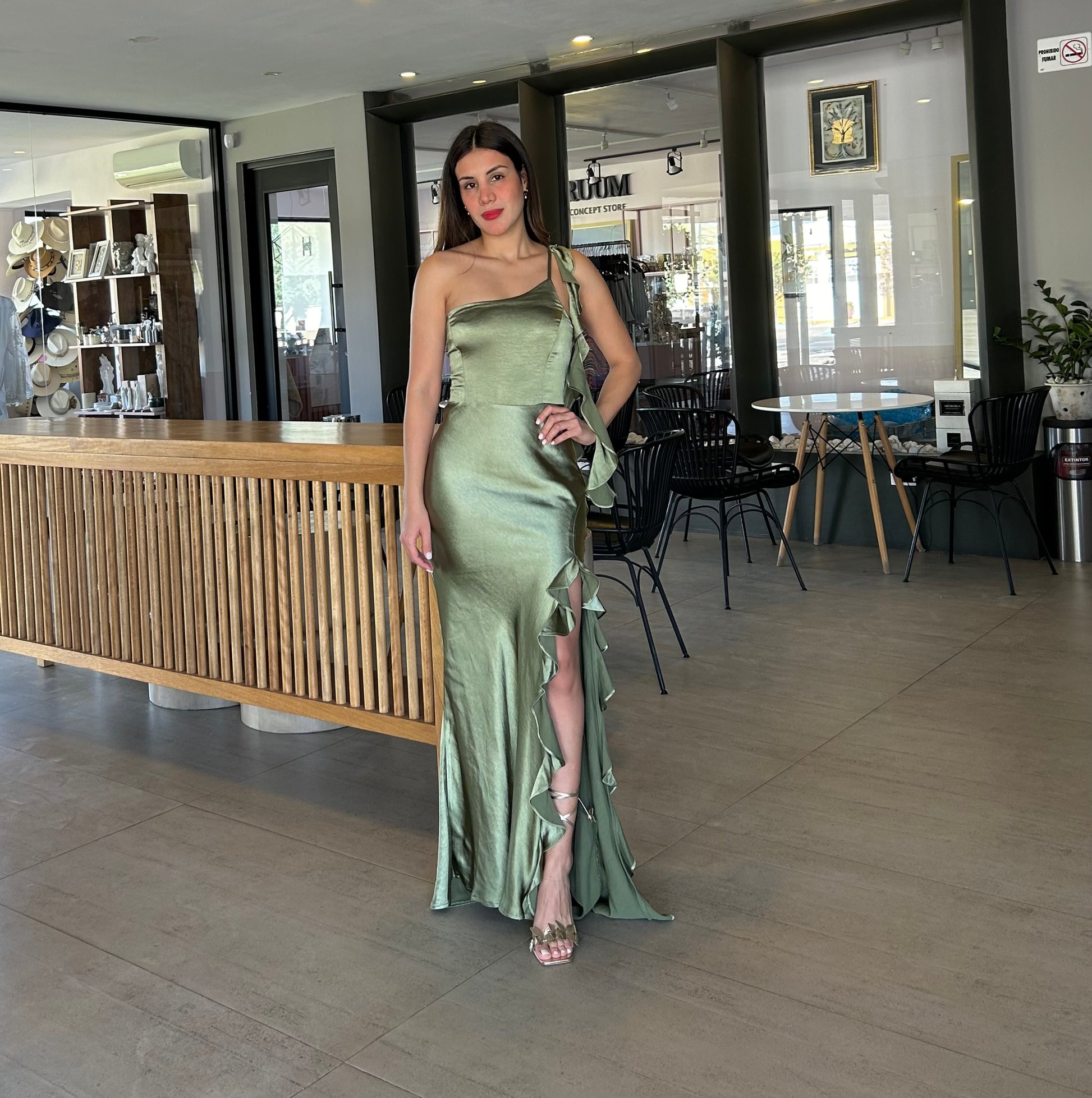 Vestido satinado color oliva con volantes, zíper al costado y diseño en caída en espalda.